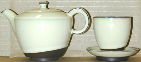 This Peaceful Tea Set is a very high quality tea set. It is comprised of one tea pot, four tea cups, and four saucers, each of which has not been entirely glazed, with the purple clay visible at the bottom of each. All of the cups and saucers in this set have dark red rims that contrast with the off-white glaze. In addition to that, the tea pot has not been glazed on the inside, giving it the properties of a Yixing tea pot while maintaining the finished look of a glazed tea set.